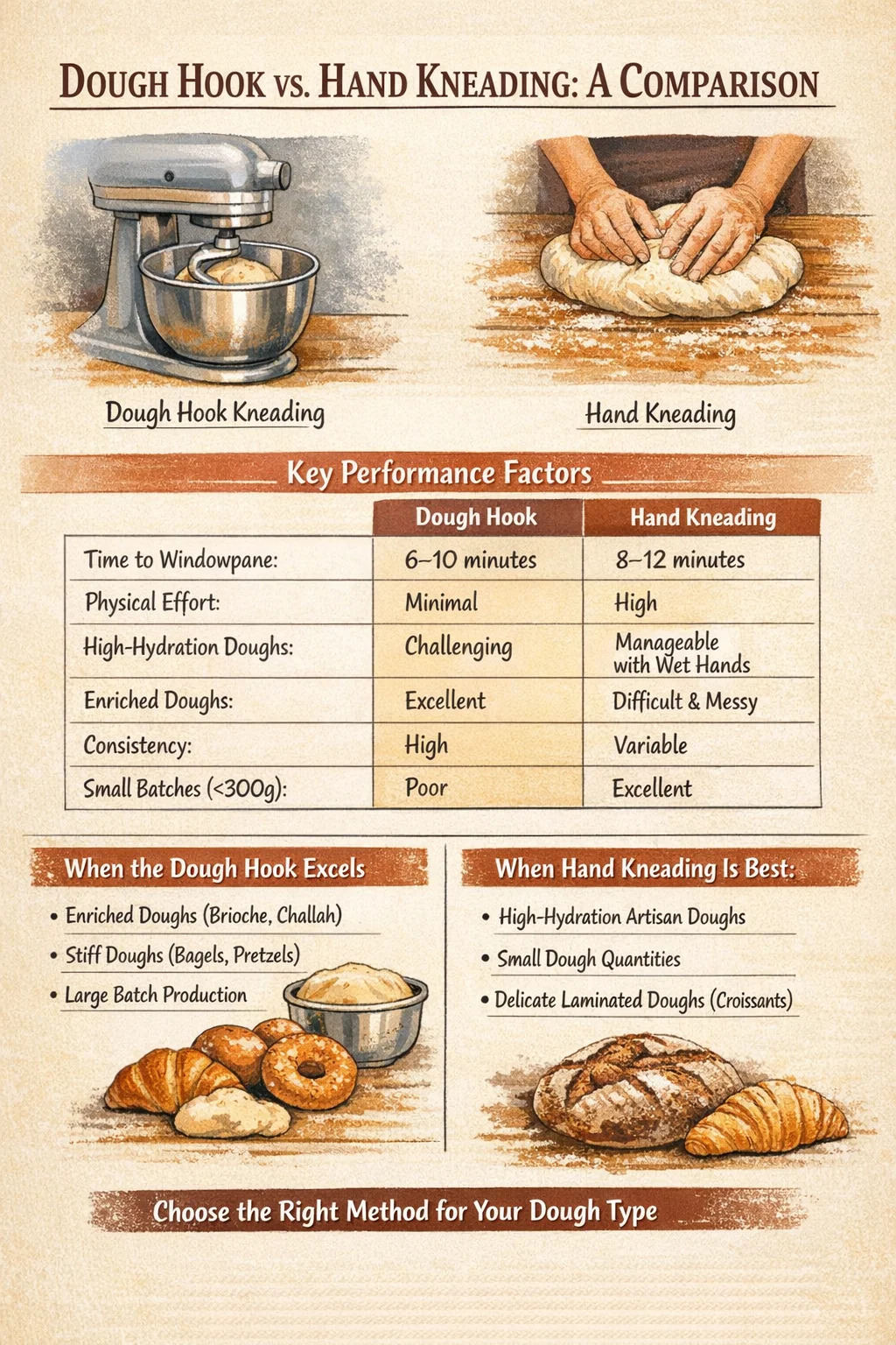 ตะขอแป้งเป็นสิ่งทดแทนที่เชื่อถือได้และใช้งานได้จริงสำหรับการนวดด้วยมือในสถานการณ์การอบขนมปังส่วนใหญ่ สำหรับแป้งขนมปังมาตรฐานใน ช่วงความชุ่มชื้น 60% ถึง 72% แป้งโดที่ได้รับการเสริมสมรรถนะ แป้งโดแข็ง และการผลิตจำนวนมาก ทำให้ได้ผลลัพธ์ที่เทียบเท่าหรือเหนือกว่าโดยใช้ความพยายามน้อยกว่ามาก สิ่งสำคัญคือการใช้ความเร็วที่เหมาะสม ตรวจสอบอุณหภูมิของแป้ง และยืนยันการพัฒนาด้วยการทดสอบบานหน้าต่าง แทนที่จะอาศัยจังหวะเวลาเพียงอย่างเดียว