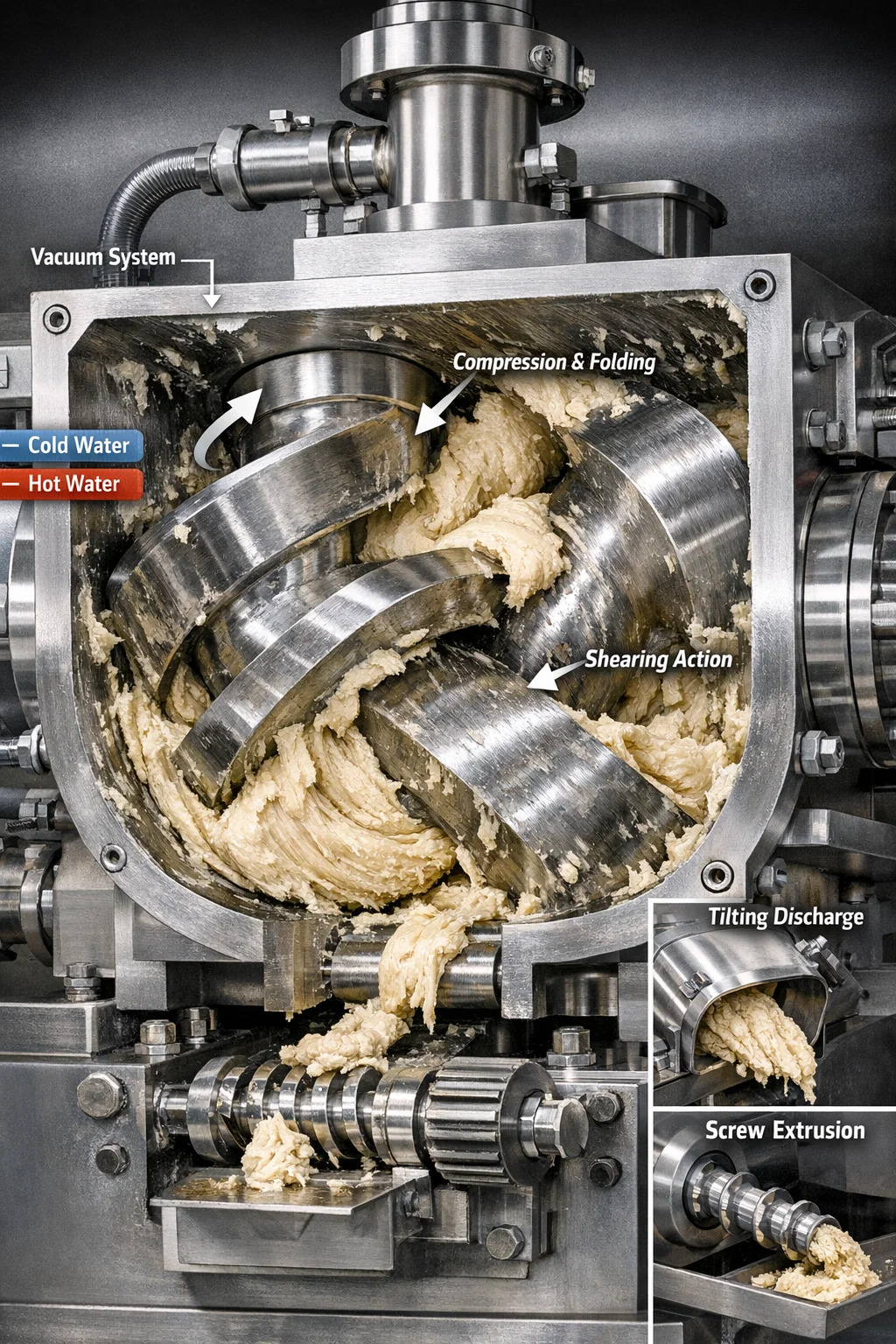 ก เครื่องนวด ทำงานบนหลักการเดียวกับการนวดแป้งที่บ้าน แต่ใช้แรงเชิงกลอันมหาศาลและโครงสร้างโลหะที่ซับซ้อน ไม่ใช่แค่ "คน" ง่ายๆ เท่านั้น แต่ยังประมวลผลวัสดุที่มีความหนืดสูงซึ่งช้อนธรรมดาไม่สามารถจัดการได้โดยการ "นวด บีบ ดึง และฉีก" ซ้ำๆ