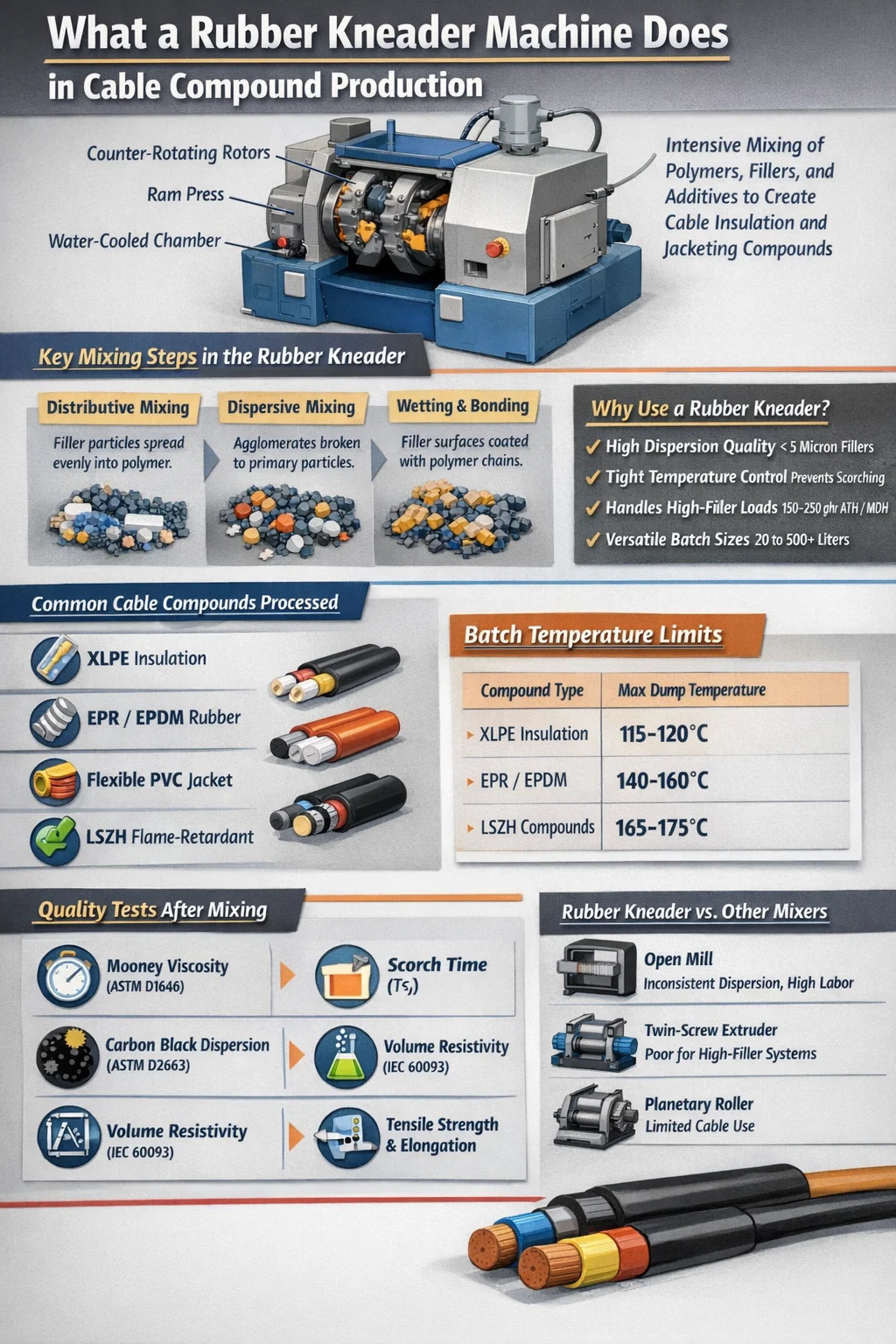 ผู้ผลิตสายเคเบิลทำงานร่วมกับตระกูลสารประกอบอีลาสโตเมอร์และเทอร์โมพลาสติก-อีลาสโตเมอร์หลายประเภท แต่ละแห่งมีความต้องการอุปกรณ์การผสมที่แตกต่างกัน และเครื่องนวดยางจะจัดการอุปกรณ์ทั้งหมดเป็นประจำ
