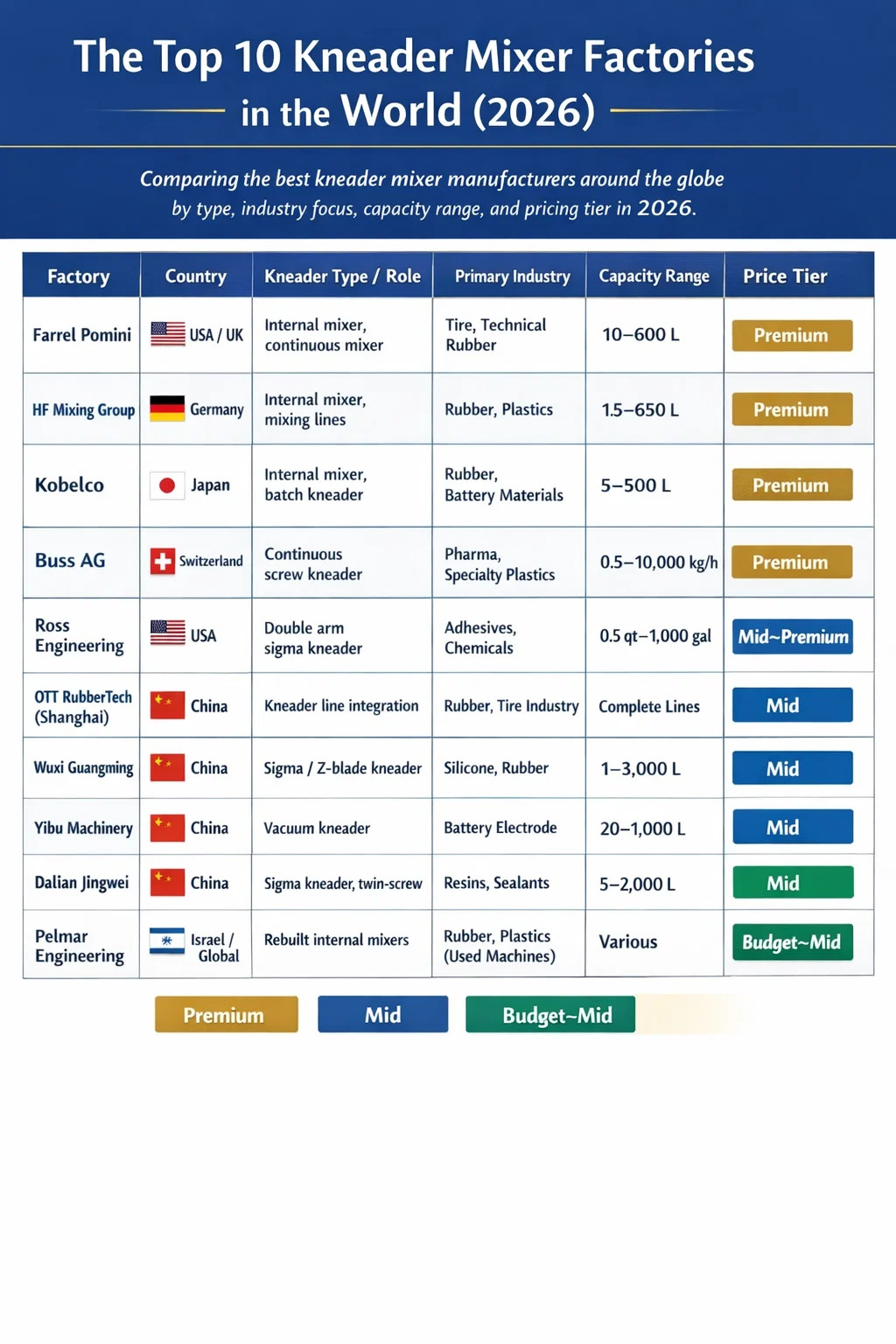 | โรงงาน | ประเทศ | ประเภท Kneader / บทบาท | อุตสาหกรรมปฐมภูมิ | ช่วงความจุ | ระดับราคา |